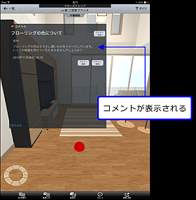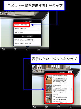 3Dデータを開き、画面下部の[コメント]→[コメント一覧を表示する]から付けられたコメントを表示します。
