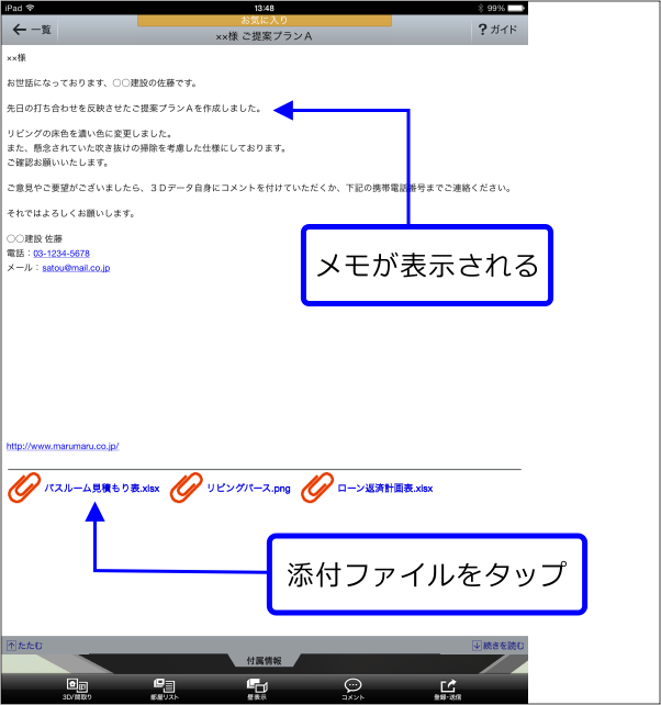 3Dデータに付けられた付属情報(メモ、WebページのURL、添付ファイル)を見られます。