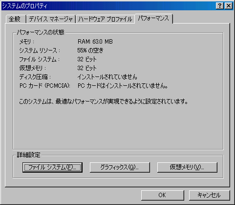 上の例は、CD-ROMドライブに問題がないときの例です。問題がある場合には、「ファイルシステム」が「32ビット」以外の表示になっていたり、「このシステムは、最適なパフォーマンスが実現できるように設定されています」の代わりに別の表示になっていたりします。