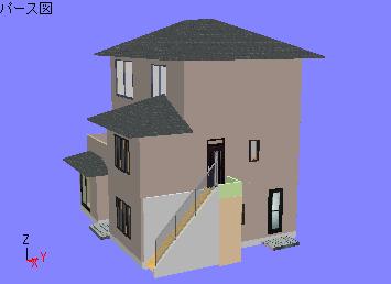 間取りの方で2階の入り口を玄関の部屋をおいて作成しています。 階段とあがりきった床の高さ、場所の調整をしながら作成しないといけませんので、立体化後にエクステリアの階層で作成された方が作成しやすいかと思います。壁のテクスチャは作成後に貼り付けてください。(ここではパーツと形状がみやすいように何も貼っていません。)