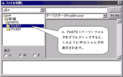 | 7. | フォルダ選択画面が表示されますので、CD-ROMドライブを指定し、「PARTS」の中の使いたいフォルダをダブルクリックしてください。「OK」をクリックしてください。 |