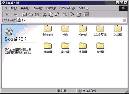| 以上の手順で、素材集CD-ROM内のパーツまたはテクスチャをハードディスクにコピーし、パーツまたはテクスチャパレットに表示することができます。 | |