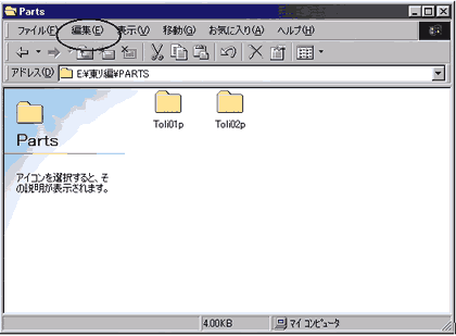 | 5. | 「編集」メニューから「すべて選択」を選択します。すると、パーツの一覧が反転表示されます。 |