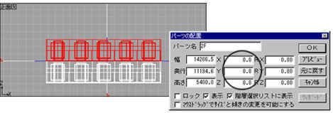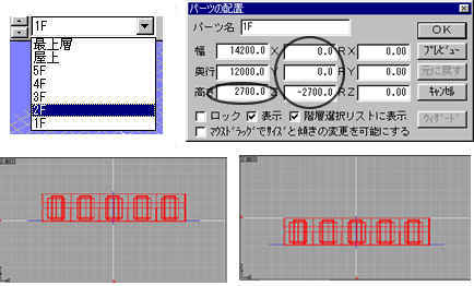 | 10. | 作成した1Fをクリックすると、一度に選択(赤く囲まれる)できます。ダブルクリックで表示される「パーツの配置」ダイアログボックスで[X][Y]に0を、 [Z]に0から高さを引いた数を入力します。これでちょうど高さ分下にずれます。 |