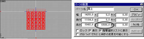 | 18. | 屋上が出来あがったら、「最上階」階層へ移動します。ここで1F〜5Fと屋上、すべてを選択できます。この状態で、[X][Y]に0を、 [Z]に1フロアの高さ×フロア数(この場合は2700×5=13500)を入力し、一度に上へずらします。 |