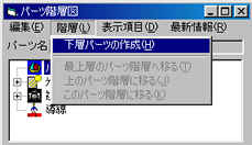まずパーツ階層リストを作成します。「ツール」の「パーツ階層図」を表示します。「ルート」を選択し、「階層」メニューから「下層パーツの作成」を選びます。 |