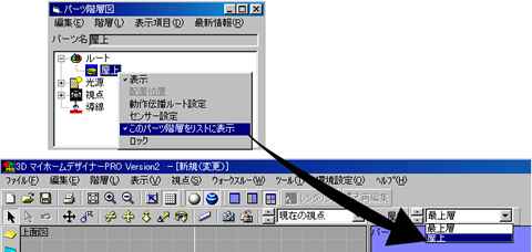 「屋上」がパーツ階層図に表示されるので、右クリックし、「この階層をリストに表示」にチェックを入れます。この作業により、3D編集画面右上の階層メニューに、その階層が表示されます。 |