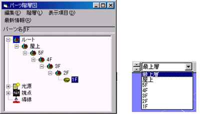 さらに、同じようにその下に5F、4F、3F、2F、1F、と順番に上の階からその下へ下層パーツを作成して行きます。また、一つ一つについて、「このパーツ階層をリストに表示」のチェックを入れます。これでマンションを作る準備ができました。 |