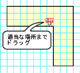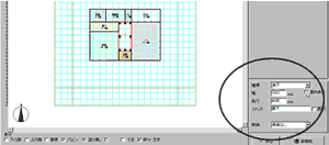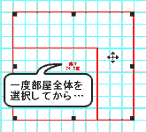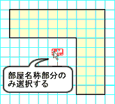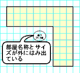 | 【部屋情報の移動方法】 部屋の形によっては、右図のように、部屋情報(部屋名称とサイズ)が部屋からはみ出た場所に表示される場合があります。 その場合は、一度部屋を選択してから、さらに部屋名称部分のみ選択し、それを適当な場所までドラッグします。 |