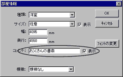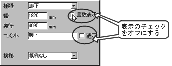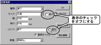 | ≪方法2≫ 部屋を選択して右クリックのポップアップメニューより「情報」を選択します。 「部屋情報」ダイアログボックスより、サイズ及びコメントの右にある「表示」のチェックボックスをオフにしてください。 |