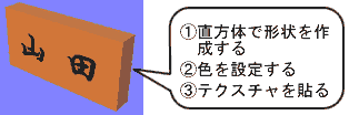 表札や看板は直方体ツールで形状を作成し、名前や文字の入ったテクスチャを貼り付けます。名前や文字が入ったテクスチャはあらかじめグラフィックソフトで作成したデータや、デジタルカメラから取り込んだデータなどを「画像加工ウィザード」で読み込んで、テクスチャとして利用できるように加工します。 |
