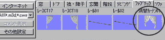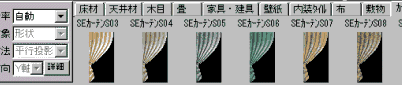 | 2. | カーテンの生地(テクスチャ)を替えるにはテクスチャパレットの[カーテン]タブの中の[SEカーテンS01]〜[SEカーテンS58]を利用します。 |
