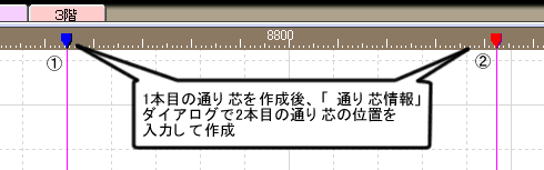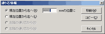 「通り芯情報」ダイアログボックスが表示されますので、現在の通り芯からコピー先までの距離を入力して、「コピー」ボタンを押します。