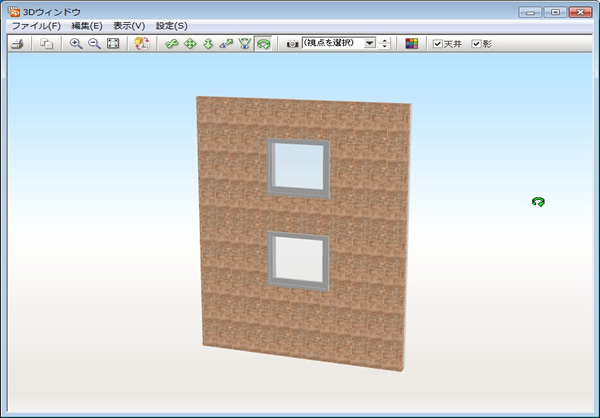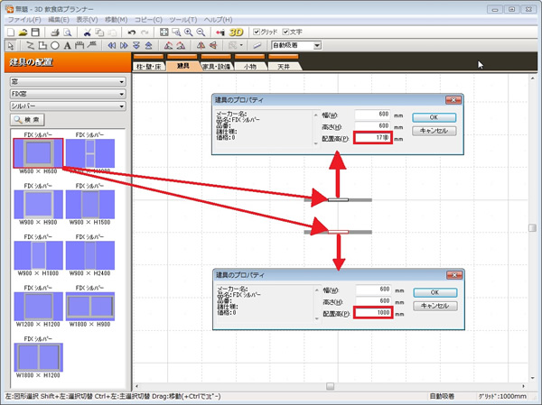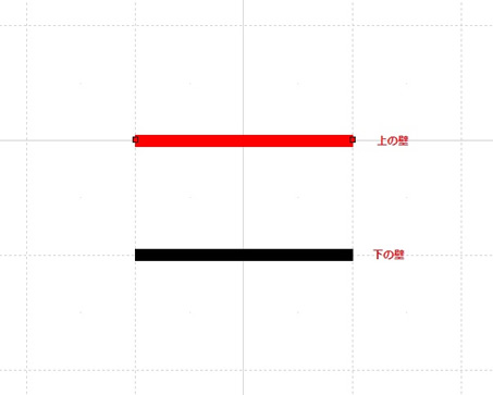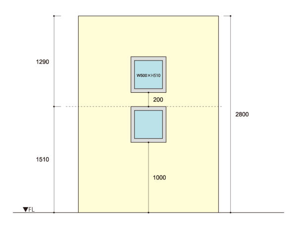 3D飲食店プランナーでは、壁一枚に対し、横方向には複数の建具を配置できますが、縦方向には配置できません。 そのため、FIX窓などを上下に並べて配置する場合は、壁も上下に分割して作成してからそれぞれの壁に対してFIX窓を配置する必要があります。 ここでは、次の図のようにFIX窓を上下2枚配置します。この作成例では、壁も下から1510mmまでの壁と1510mm〜2800mmまでの2枚の壁を作成し、それぞれの壁にFIX窓(W500×H510)を配置します。