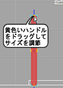 | 4. | 「前からみた図」又は「横からみた図」で円形の上部にある黄色いハンドルを上の方にドラッグして、柱を屋根がのる高さまで伸ばします。 |