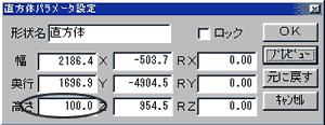 | 7. | 作成した四角い形状を選択した状態(赤い線で囲まれています)のまま、これをダブルクリックして、「直方体パラメータ設定」画面を開き、右のように高さ(厚み)を設定します。 |