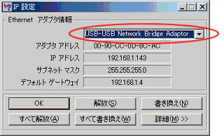 IP設定ウインドウ内の「Ethernetアダプタ情報」を、お使いのUSBリンクケーブルのアダプタ名に変更。 |