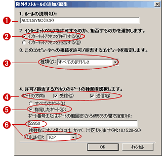 [参考情報] 上記以外の方法でACCUSYNCの接続方法をTCP/IP(アドレス指定)に変更する方法もございます。この場合、除外リストの設定を行うことで、ファイアウォールの状態に関わらず、接続が可能です。 ただし、接続先のコンピュータのIPアドレスが固定でない場合は、接続時に毎回、相手のIPアドレスの確認が必要になりますのでご注意ください。 なお、 「ウイルスバスター2004 インターネットセキュリティ」では、ACCUSYNCの接続方法に関わらず、2台のマシンともにファイアウォールが有効な状態でお使いいただけます。