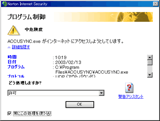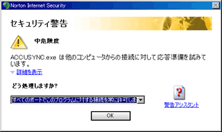| 「Norton Internet Security 2003」でファイアウォールをオンにしている場合、ACCUSYNC起動時に以下のような画面が表示されることがあります。その場合、各画面で処理選択することで次回のACCUSYNC起動時よりこれらの表示はなくなります。 |