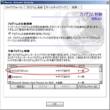 「プログラム制御」タブを選択して、手動プログラム制御の一覧でACCUSYNCが「すべてを許可」になっているかどうかを確認 |