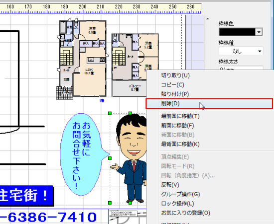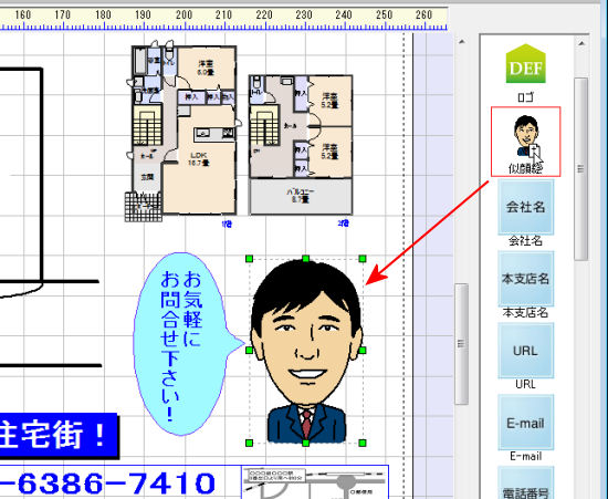 テンプレートを開いた際、自社情報に登録しているテキスト情報は自動的に差し込まれますが、似顔絵や地図などの画像は差し込まれません。 テンプレートに配置されている似顔絵や地図などの画像を削除し、自社情報パレットから新たに配置します。