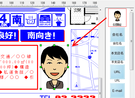 テンプレートを開いた際、自社情報に登録しているテキスト情報は自動的に差し込まれますが、似顔絵や地図などの画像は差し込まれません。 テンプレートに配置されている似顔絵や地図などの画像を削除し、自社情報パレットから新たに配置します。