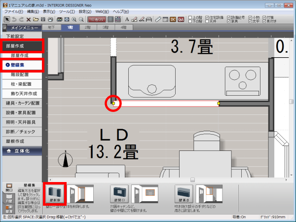 ■詳細 壁編集の[壁削除]や[壁開口]で、壁の角まで壁編集をしたとき、角の部分まで壁が削除、または開口されます。 ■操作方法壁編集の[壁削除]、または[壁開口]を利用して、壁の角まで設定したとき、立体化すると下の図のように壁の角まで削除、または開口されます。 角が削除、または開口された部分に、壁厚と同じサイズの「四角柱」を配置して埋めます。