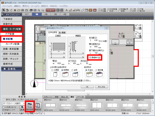 ナビの[建具・カーテン配置]−[窓配置]を選択し、パレットの[造作出窓]ボタンをクリックします。
