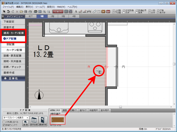 ナビの[建具・カーテン配置]−[ドア配置]を選択し、造作出窓の下に、収納のためのドアを配置します。