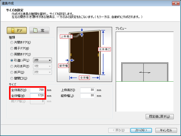 ドアの高さは、最初に[造作出窓のプロパティ]で設定した[壁下端からの高さ]が上限となります。