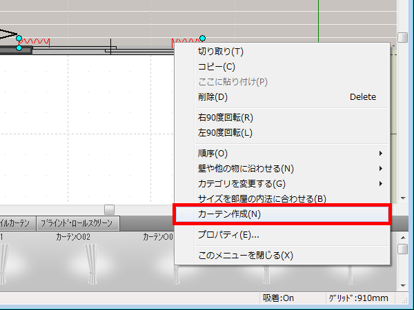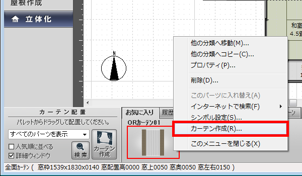 すでに窓に配置しているカーテンパーツを編集したい場合は、配置されているパーツをクリックして選択してから右クリックし、[カーテン作成]を選択します。