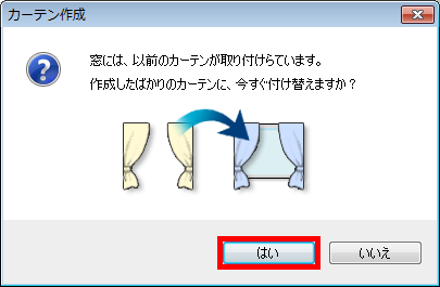 配置済みのカーテンパーツを編集して、同じファイル名で保存した場合、すでに配置されているカーテンパーツを、新たに編集したカーテンパーツに入れ替えるかのメッセージが表示されます。