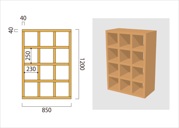 形状作成ツールの「3D多角形」を利用して、下の図のような格子状の飾り棚パーツを作成する方法をご紹介します。