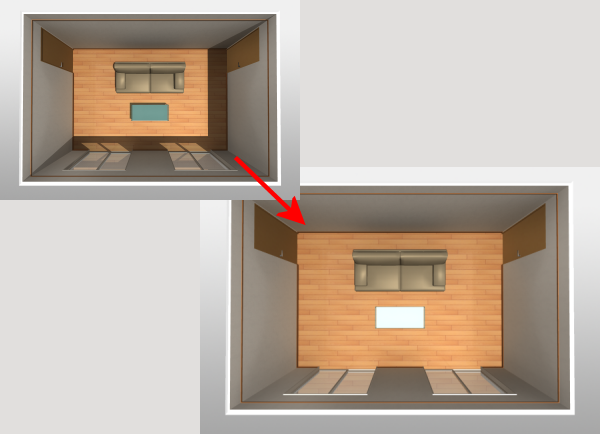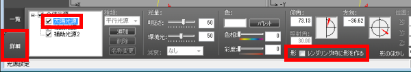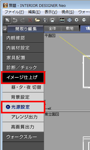 鳥瞰図などのレンダリング時に影を生成したくいない場合には、光源設定の一部を変更するだけで簡単に影を表示させ ないようにすることができます。 鳥瞰図で影が不要な場合や、多数の影が室内に表示されている場合に便利です。