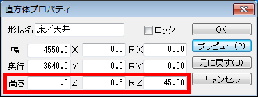 配置した床をダブルクリックし、[直方体プロパティ]を表示します。