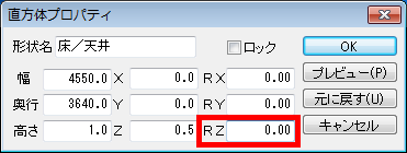 床をダブルクリックし、[直方体プロパティ]を表示します。