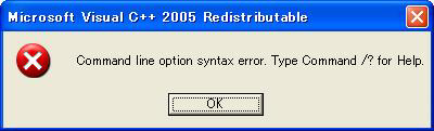 ■詳細Windows XPの環境でインストール開始すると、次のような[Microsoft Visual C++ 2005 Redistributable]のエラーメッセージが表示される。 ■原因Windows XPの環境で、ユーザー名が日本語になっている場合、「Microsoft Visual C++」のインストールができないという報告があります。 ■対処方法【アップデートをおこなう】ユーザー名が日本語になっている場合でもインストールできるプログラムを、アップデータに含めました。 【アップデートしてもインストールできない場合】次の「vcredist_x86.EXE」のリンクをクリックしてプログラムをデスクトップにダウンロードしてください。 ダウンロードした「vcredist_x86.EXE」をダブルクリックするとインストールが開始されます。 |