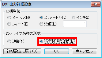 ■詳細DXF出力したファイルをAutoCADで読み込めない。 ■原因AutoCADの古いバージョンでは、レイヤ名に日本語が含まれていると読み込みできません。 ■対処方法DXF出力する際、レイヤ名を「必ず数値に変換」に設定します。