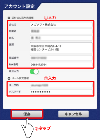 - 「STARFAX 16」で登録したグループIDとパスワードを入力して[保存]をタップします。