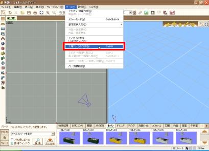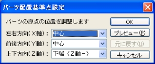 パーツを選択して、メニューの [編集] から [ パーツ配置基準点設定 ] を選択します。[ パーツ配置基準点設定 ] ウィンドウで、[ 左右方向(X軸) ] を [ 中心 ] 、 [ 前後方向(Y軸) ] を [ 中心 ] 、 [ 上下方向(Z軸) ] を [ 下端 ] に設定して [ OK ] をクリックします。