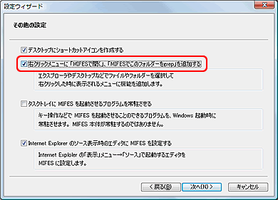 設定ウィザードの画面内容を確認しながら[次へ]で進み、「その他の設定」で『右クリックメニューに「MIFESで開く」、「MIFESでこのフォルダーをgrep」を追加する』にチェックをつけます。