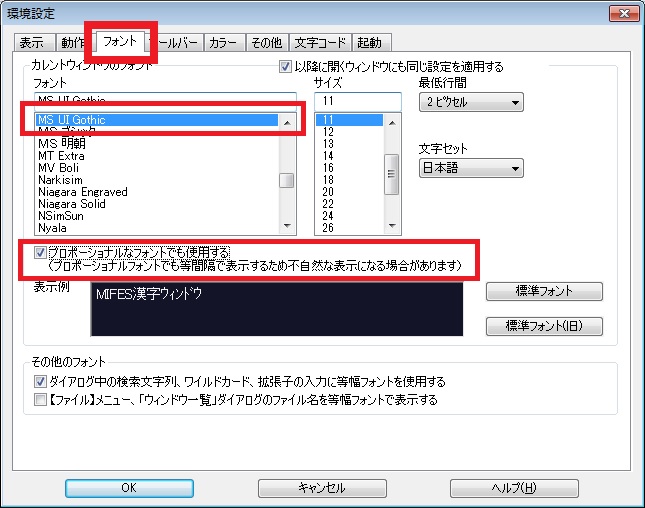 フォントを変更して、「表示例」欄に「このフォントとサイズの組み合わせは使用できません」と表示されたときは、「プロポーショナルなフォントでも表示する」にチェックをつけてください。