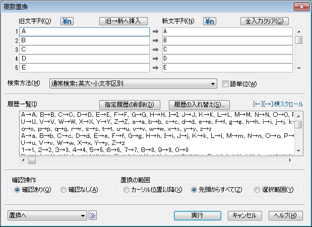 最大20組までの旧・新文字列を指定して、カレントウィンドウ内で一括置換ができます。