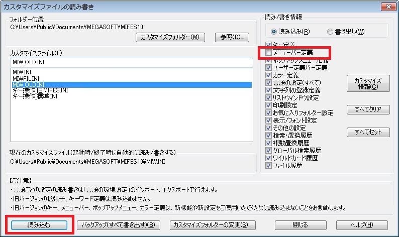■回答MIFESのカスタマイズファイル「MIW.INI」のメニューバーの定義部分が壊れたものと思われます。 カスタマイズファイルを使わずにデフォルト状態で起動して、メニューバー以外の設定を戻す方法で対応できます。 以下の順番で操作してください。