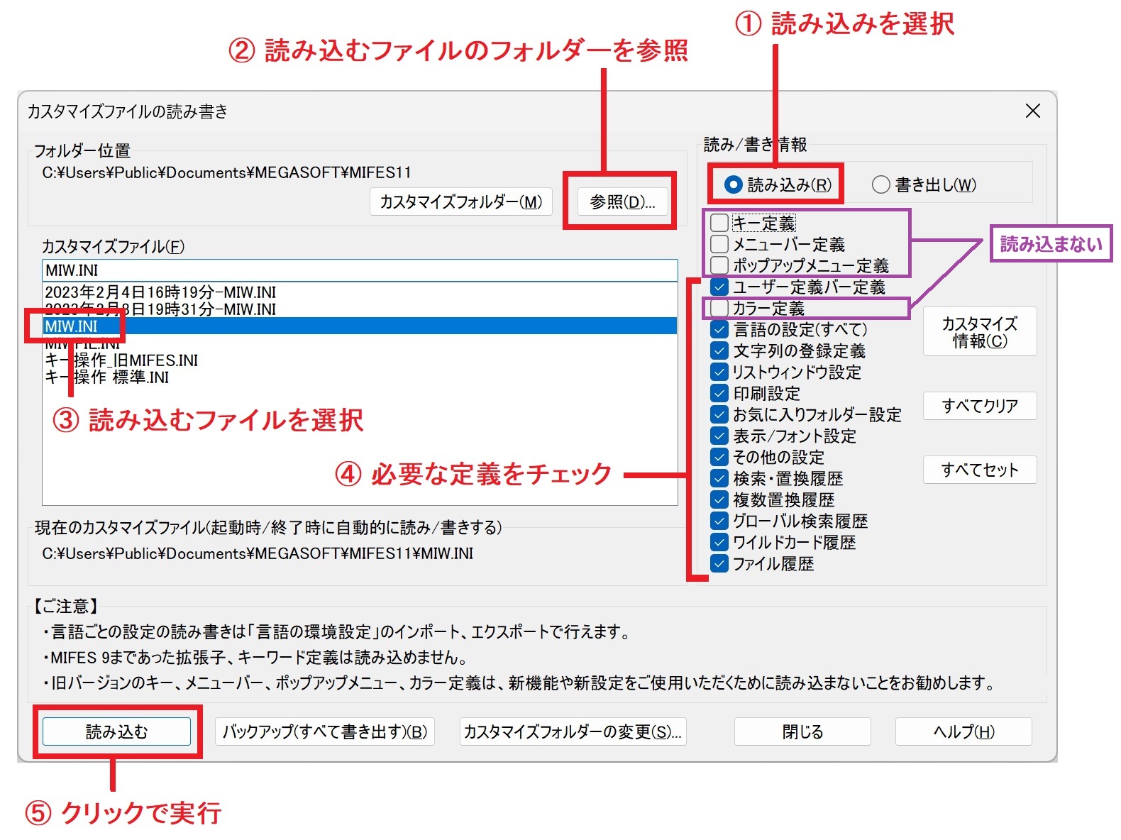 ■回答MIFESのカスタマイズ情報や履歴はカスタマイズファイル(通常は「MIW.INI」)に記録されています。 MIFESを起動して【設定】-【カスタマイズファイルの読み書き】を実行し、これまでご利用のカスタマイズファイルを選択して、必要な定義だけにチェックをつけて「読み込む」を実行します。 その後、MIFESを再起動します。 詳しくはヘルプをご参照ください。 ※旧バージョンのカスタマイズファイルをコピーしてそのままご利用することは推奨いたしません。