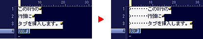 逆に、一斉に行頭のタブを削除するときは、対象の行を選択状態にして、[Shift]キーを押しながら[Tab]キーを押してください。 ※「Tabキーの動作」およびタブ位置の設定は、【環境設定】-【表示】タブで変更してください。 |