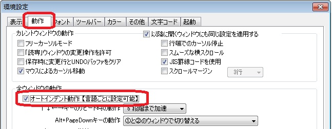 ■回答オートインデント機能と一括インデント機能があります。 ■オートインデント機能 オートインデント機能とは、行頭にタブやスペースが挿入されている行で改行すると、次の行頭に同じようにタブやスペースが挿入される機能です。 【設定】-【環境設定】-【動作】タブの「オートインデント動作」のチェックをONにしてください。