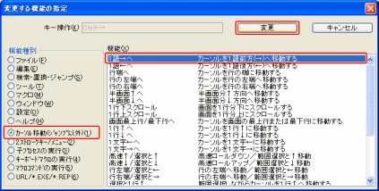 「変更する機能の指定」ダイアログボックスで、「機能種別」の「カーソル移動(ジャンプ以外)」を選択し、「機能」欄で「1語→へ」を選択します。 |