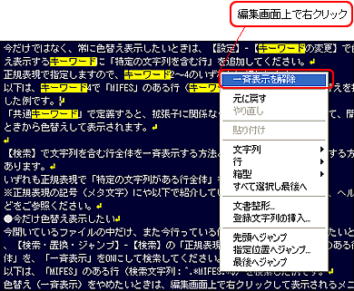 ■回答【検索】や【グローバル検索(grep)】を実行するときに「一斉表示」を指定すると、検索された文字列がすべて一斉に強調表示されます。 強調表示を解除したいときは、編集画面上で右クリックし、メニューから【一斉表示を解除】を選択してください。
