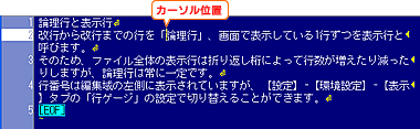 | 行番号を「論理行番号」で表示している場合には、行番号をクリックすると論理行頭にジャンプできますが、論理行末へジャンプする機能はありません。